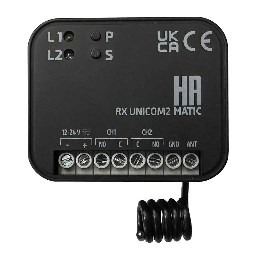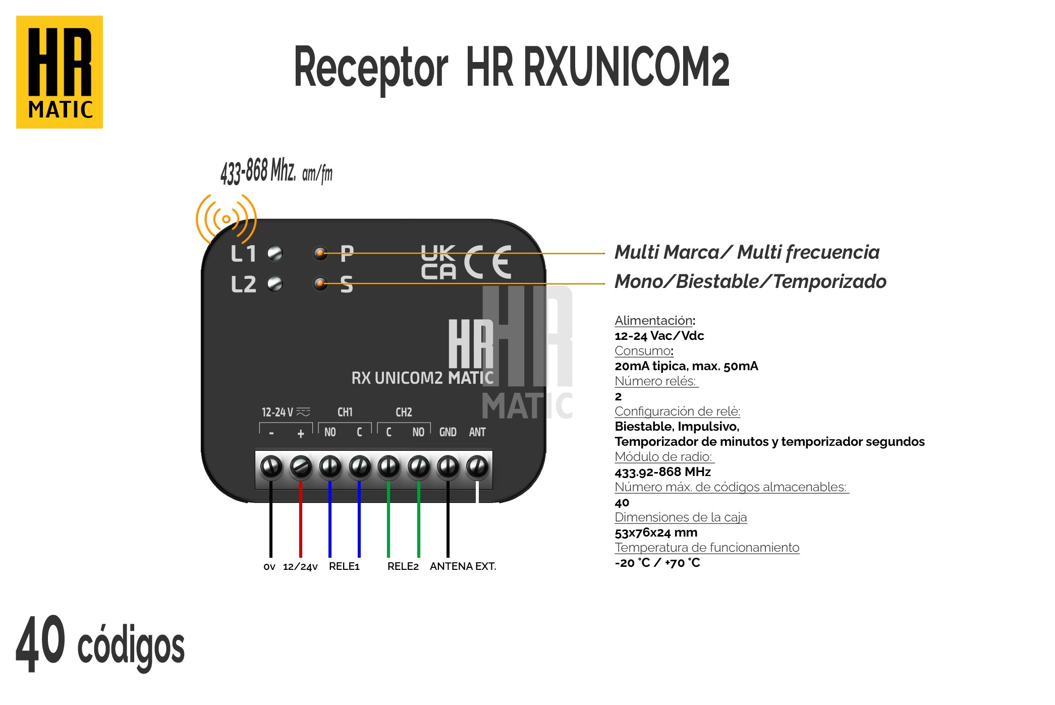 The HR RXUNICOM2 receiver can store fixed codes and variable code codes at frequencies from 433.92 to 868 MHz